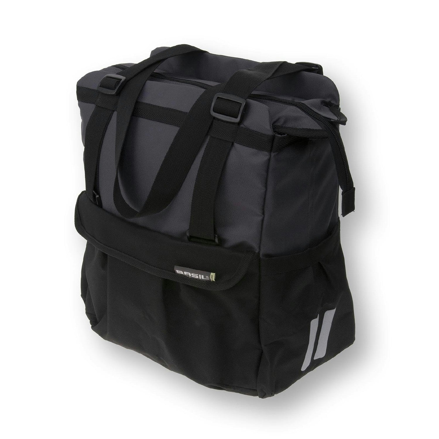 Discover the Basil Shopper XL, a bag that effortlessly combines a sleek design with practicality. Its innovative hook-on system allows easy attachment to your bike’s luggage carrier. This bag, available in timeless black, boasts a spacious interior that’s tailor-made for your shopping trips. With a generously sized front compartment, roomy interior, and convenient side pockets, you’ll have all the space you need. It even features bottle ties for securing additional essentials. Offering a substantial capacity of 20 litres, this bag is the ultimate choice for those seeking a sporty yet capacious companion to carry all their daily necessities. Crafted from water-repellent material, it’s well-prepared for any weather conditions. The adjustable shoulder straps enhance its portability, whether you’re on the road or off it. Not to forget, the reflective accents amplify safety. Explore our online collection today to find coordinating attachments that effortlessly affix to your luggage rack, or explore the array of essential designs Basil has to offer.