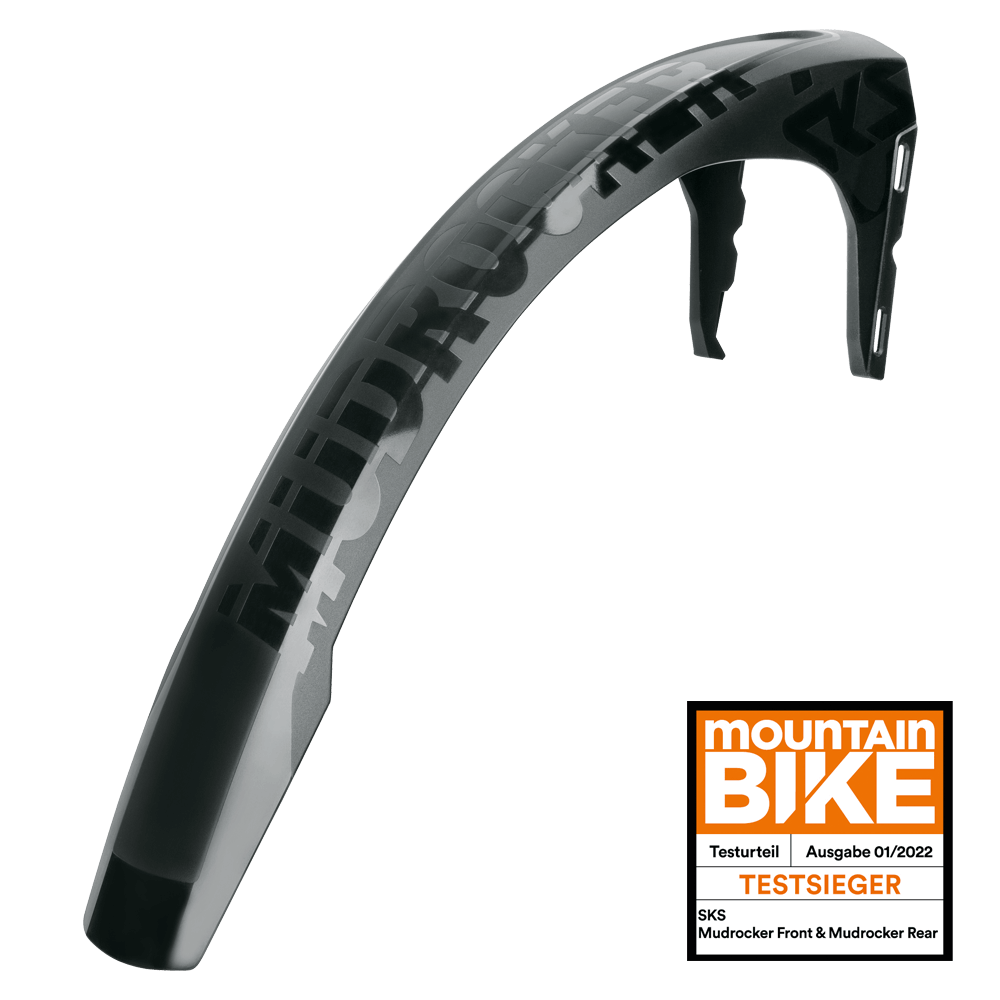 The best solution in the case of all eventualities: the SKS mudguard made of fiberglass reinforced plastic in a black, matt-gloss design is integrated on the rear wheel in such a way that the frame and wheel form a single unit. The very long mudguard perfectly deflects dirt and spray water. Another advantage: the MUDROCKER is also suitable for full suspension bikes and mountain bikes with a Vario seat post. It is mounted on the seat bars of the rear fork with rubberised hook and loop fasteners. The soft, wedge-shaped pad in the mounting brackets protects the frame, can be rotated and used in two different positions for height adjustment. Like this, the distance to the tyre can be perfectly adjusted.